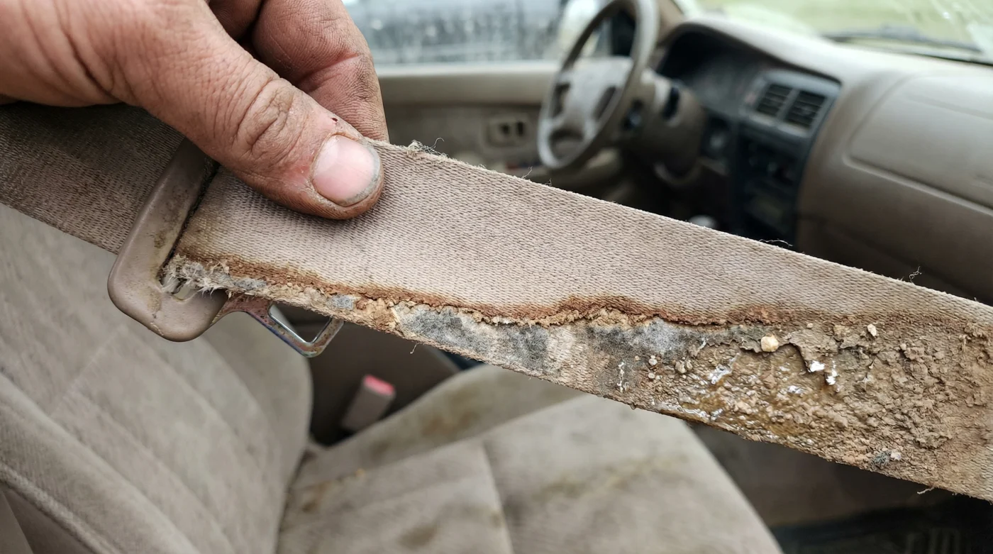 Does a dirty seatbelt always mean the car was in a flood? No. Spilled coffee or dirty hands can stain the upper sections of the belt. However, an abrupt, horizontal line of dirt found exclusively on the final foot of the hidden spool is highly indicative of standing water.