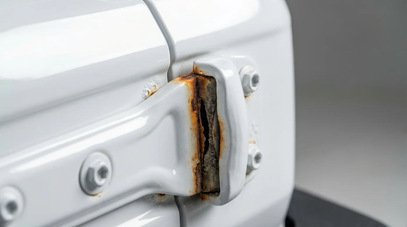 Surface rust is cosmetic, but if it originates from behind the hinge block, it signals water is penetrating the body tub.