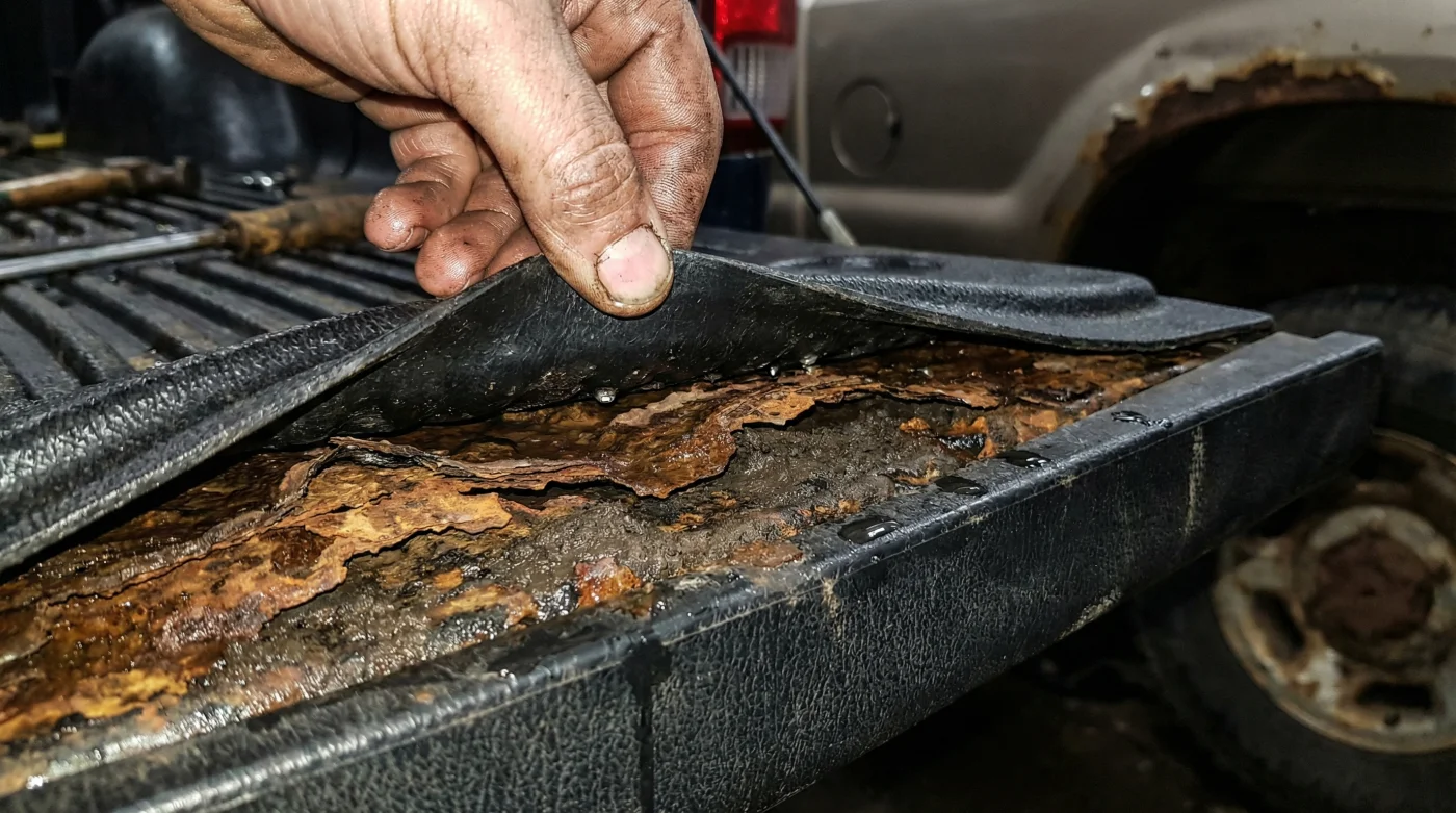 - Drop the tailgate and inspect the gap: Shine your flashlight into the narrow space between the end of the plastic liner and the metal bed floor. Look for flaking rust or damp dirt packed into the crevices.