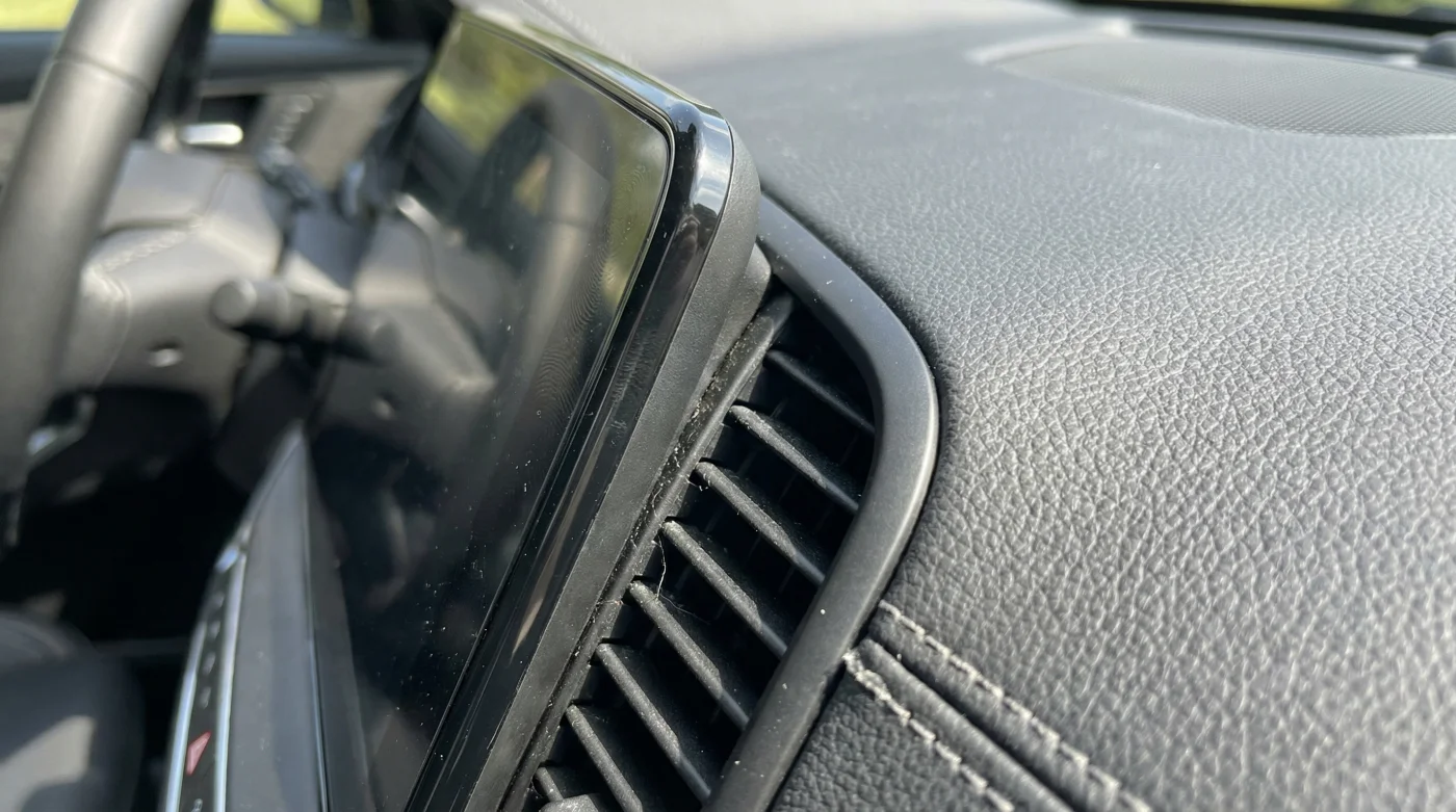 You lean forward, squinting at the dashboard architecture to figure out where the breeze is hiding. To achieve that minimalist, premium look, the interior designers heavily recessed the primary air conditioning vents. They sit tucked deeply behind aesthetic ledges, half-shadowed by the protruding central infotainment screen and the thick steering column cowl. The thin, delicate louvers barely tilt high enough to clear your knuckles when your hands rest on the wheel.